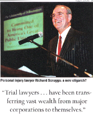 Something similar is happening in the United States. Trial lawyers who have been targeting major industries have been transferring vast wealth from major corporations to themselves. The prime example is the series of lawsuits filed by the states against the big tobacco companies. Enormous sums have been transferred from smokers, a downscale group, and tobacco companies, owned by many Americans through pension and mutual funds, to state governments and trial lawyers. Last December an arbitration panel awarded $8.2 billion to trial lawyers representing the four states that were not part of the national tobacco settlement, to be taken out of the $34.4 billion awarded the four states. Recipients include Mississippi lawyer Richard Scruggs, brother-in-law of Sen. Trent Lott. Fees have not been settled for the other 46 states, but it is clear that the tobacco cases will produce several dozen trial lawyers with the net worth -- and potential political leverage -- of Ross Perot or Steve Forbes.